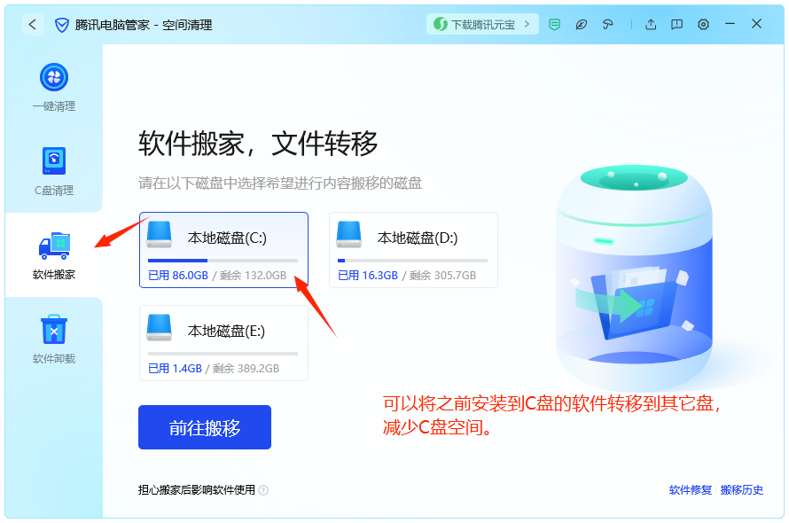 4.软件搬家。选中C盘,然后进行搬迁。