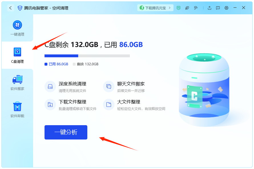 3.C盘清理。点击一键分析,然后清理即可。