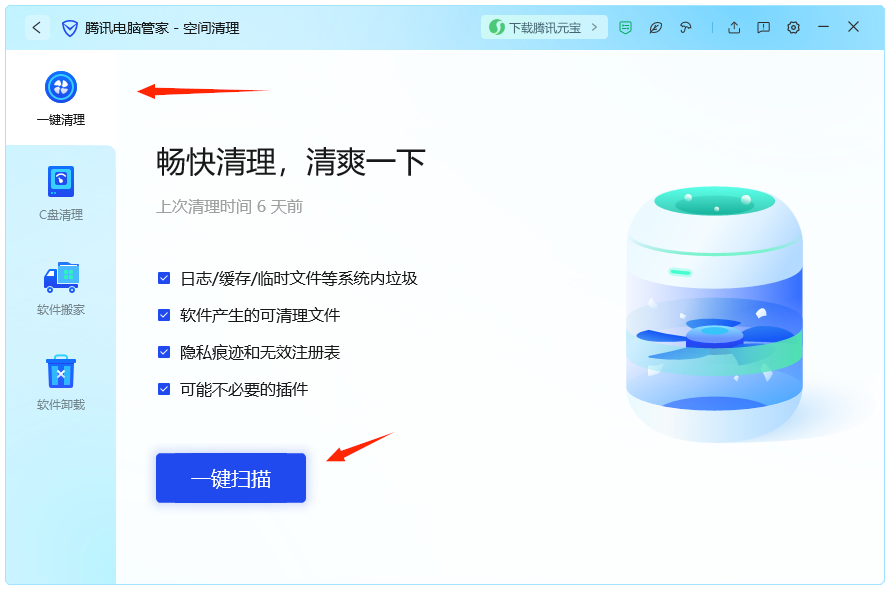 2.一键清理,点击一键扫描,然后进行清理即可。
